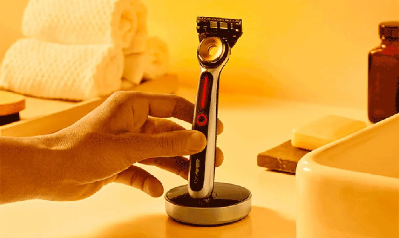 Pour charger le Rasoir Chauffant, posez-le sur la station de recharge. Lorsque le rasoir est correctement placé en position verticale, le chargement démarre automatiquement.